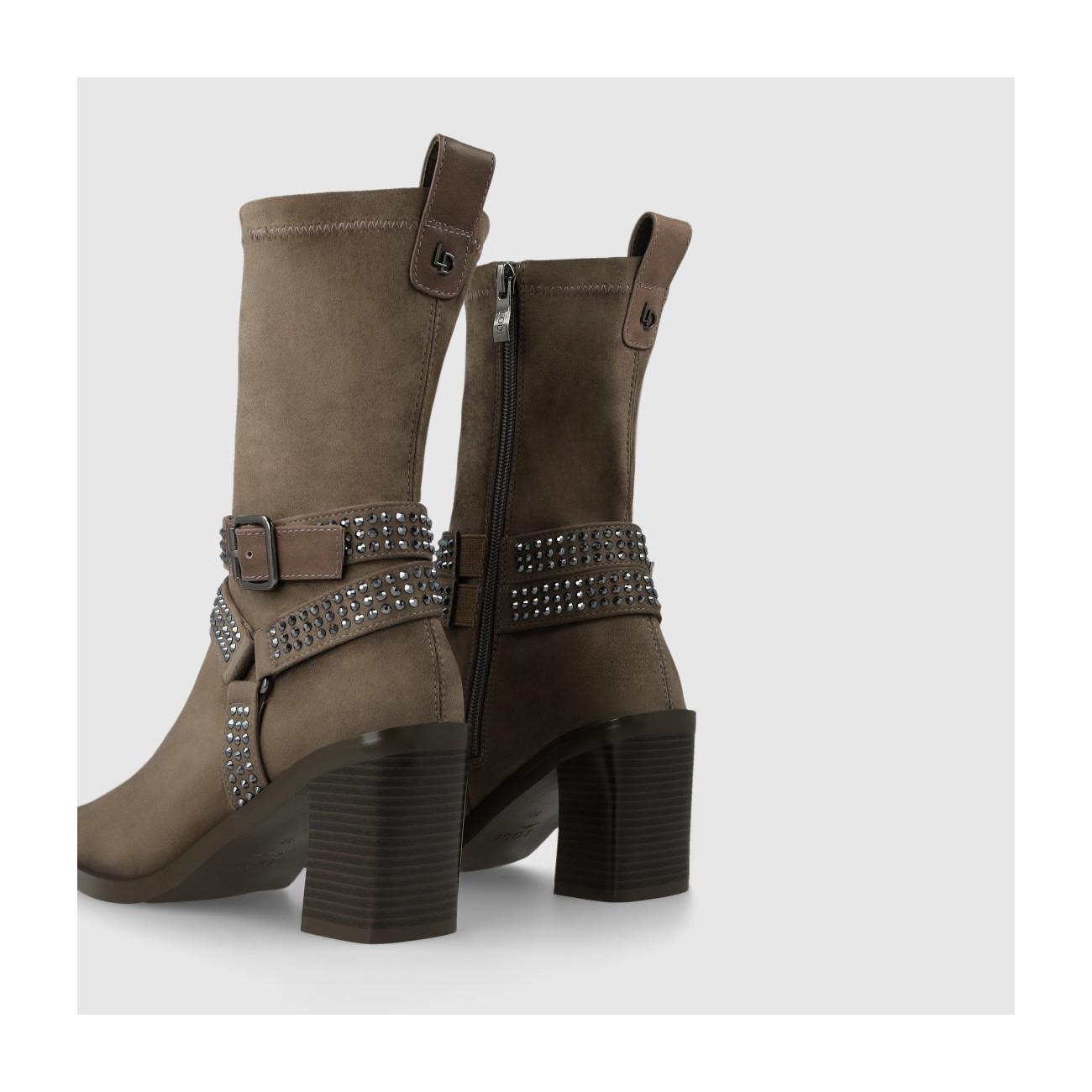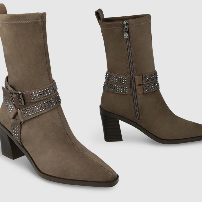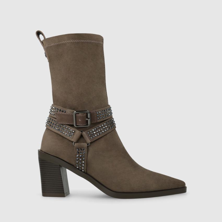 Botines de mujer de DA5092 LODI en antelina visón. Detalle de correas con remaches metálicos. Tirador en piel. Un diseño confeccionado con tacón de 7.5 cm de altura. Cierre en lateral interior mediante cremallera. Punta fina. Interior forrado en tejido y planta en piel. Incluye planta new gel para mayor comodidad en todas tus pisadas.