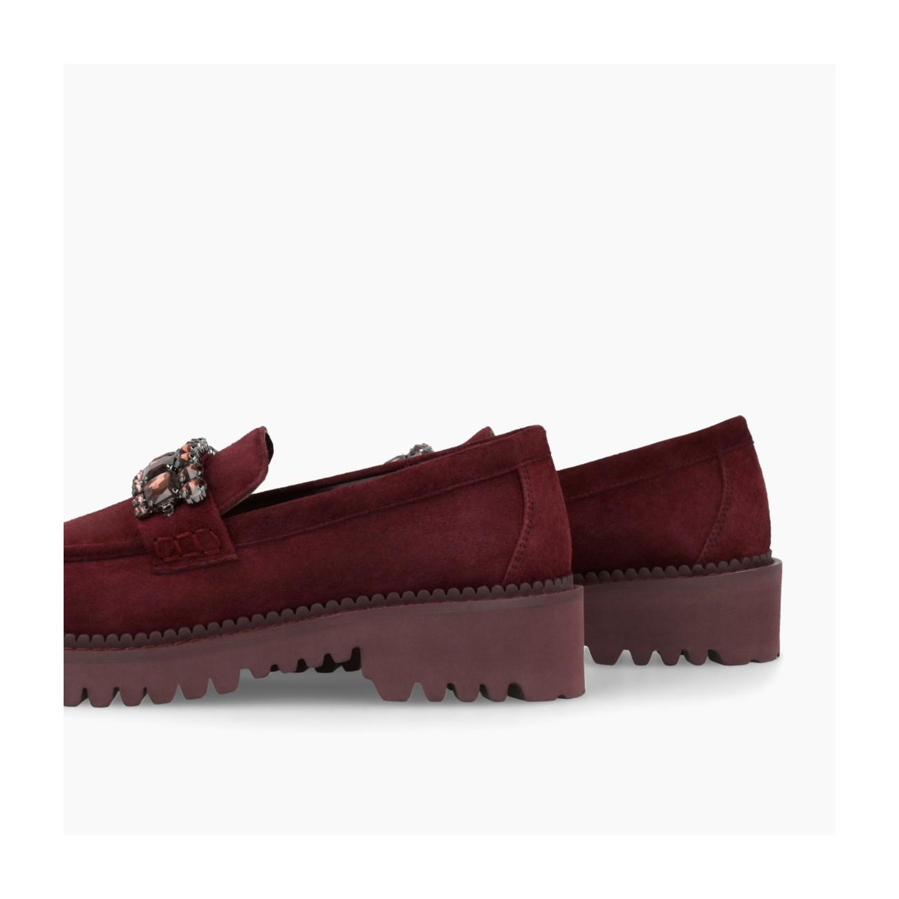 Mocasín en ante color burdeos con antifaz de pedrería. Es el complemento ideal para cualquier outfit. Interiores y plantilla de piel.