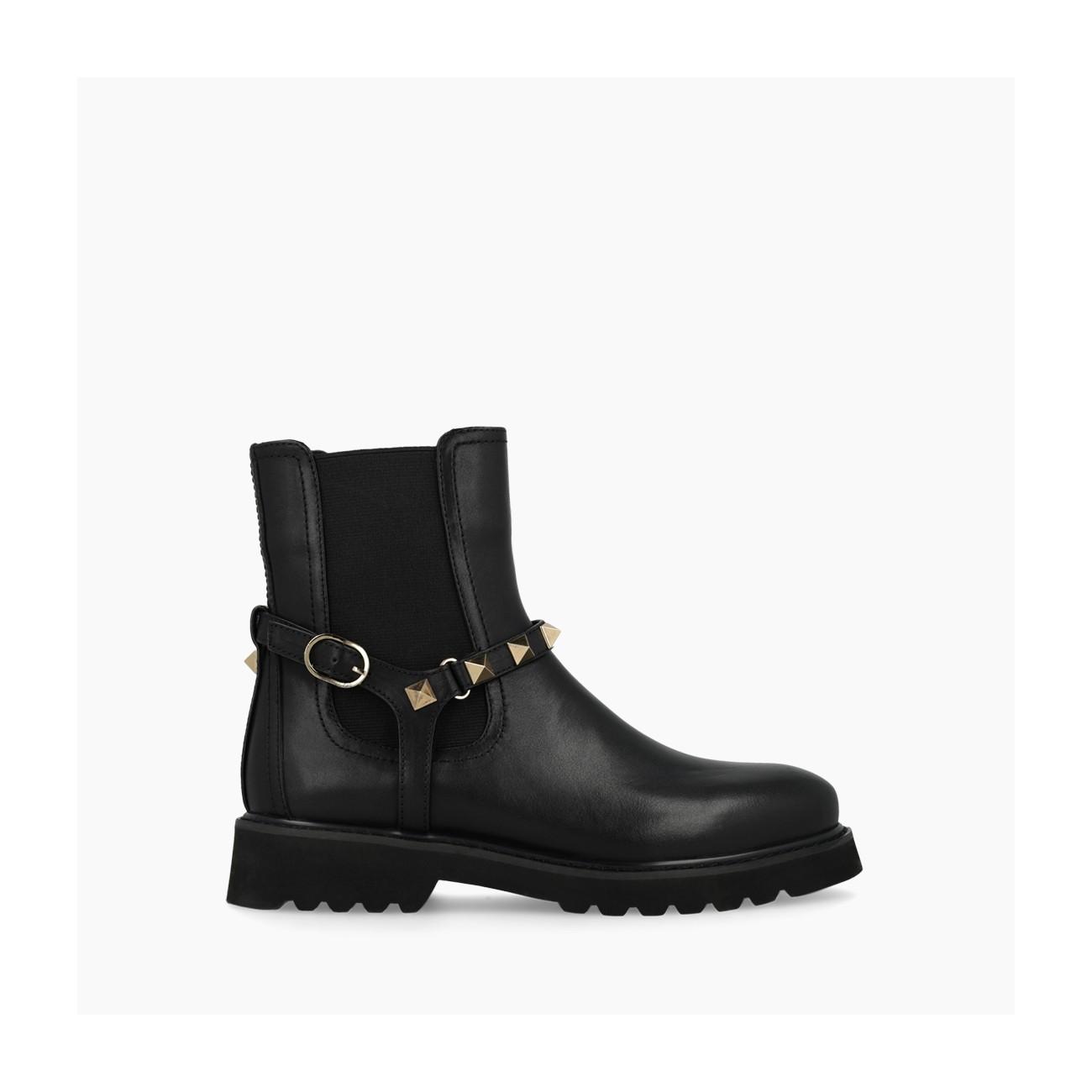 Botín en piel negra tipo chelsea con elásticos en los laterales y remaches en la parte del tobillo. Plantilla y forro interior de piel.