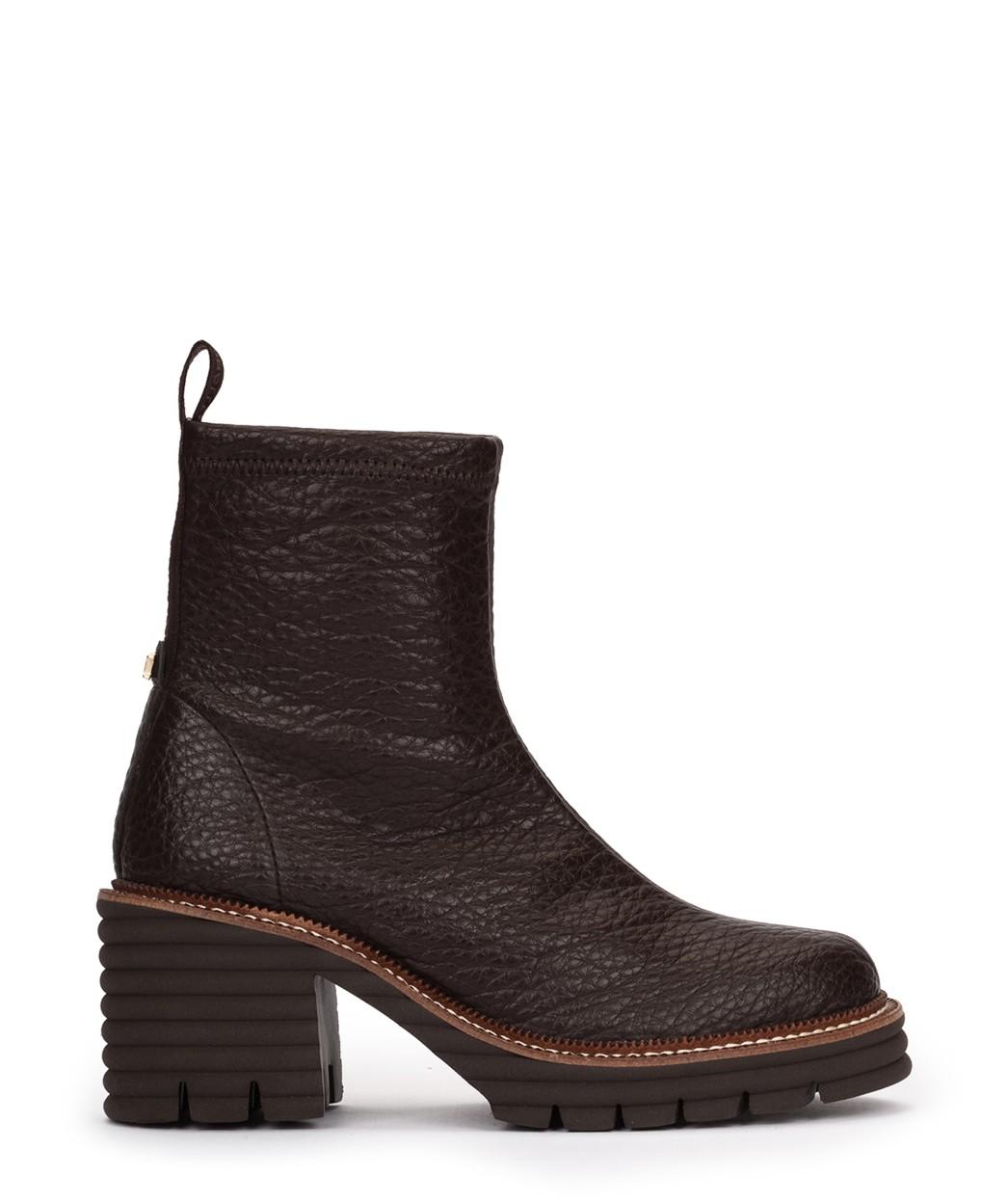 Botines para mujer de Pedro Miralles confeccionados en tejido elástico efecto piel en color marrón. Interior afelpado. Lleva un tratamiento water repellent. Tirador trasero con el logo de la marca. Piso dentado de caucho con cómodo tacón de 7 cm. y plataforma de 2,3 cm