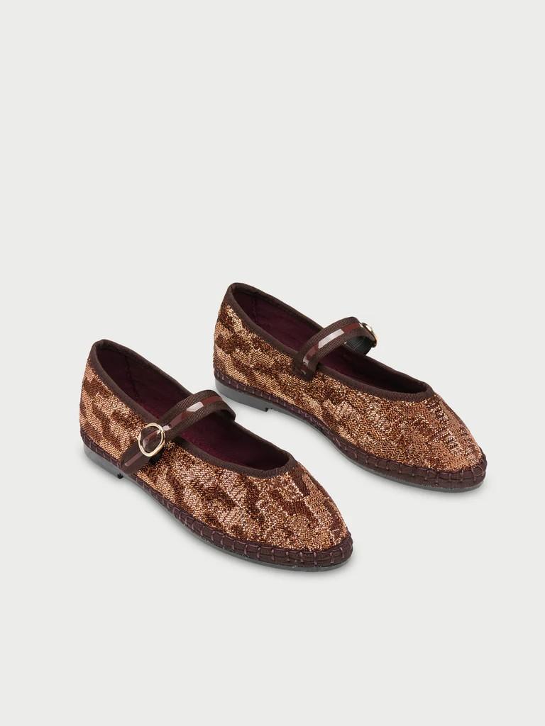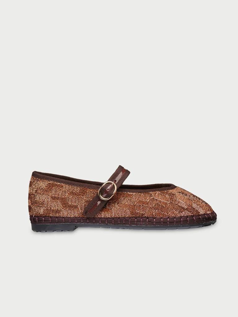 Merceditas de tejido brillante de LUREX en color bronce con ribetes en color marrón y cierre de hebilla.