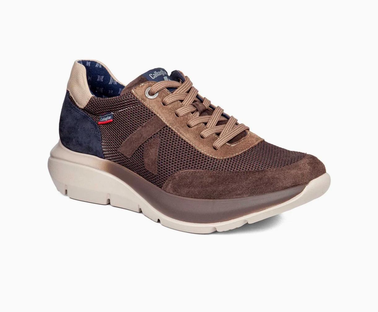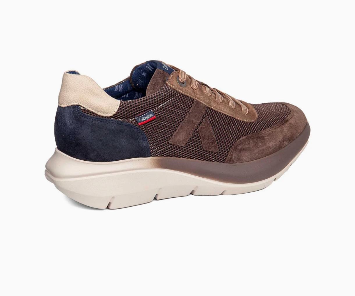 Zapatilla deportiva para hombre de la marca española CALLAGHAN . Fabricado en serraje y tejido de color marrón con la talonera en ante azul marino.